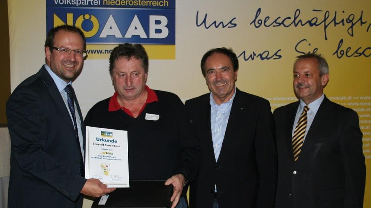 Leopold Simonitsch aus Petronell erreichte den 37. Platz und Herr Toni Horvath aus Sommerein den 39. Platz. „Wir haben uns als Team in der Landeshauptstadt insgesamt nicht schlecht geschlagen und unseren Bezirk gut vertreten - wir sind zufrieden“, so die NÖAAB-Bezirksobfrau Stellvertreterin Christine Besser. Neben NÖAAB-Geschäftsführer BR Bernhard Ebner gratulierten die obersten NÖAAB-Arbeitnehmervertreter AKNÖ-Vizepräsident Franz Hemm und der Obmann der NÖ Landespersonalvertretung Hans Freiler. „Noch nie war das spielerische Niveau so hoch. Da sind die Plätze 37 und 39 unter den vielen Teilnehmern schon eine sehr gute Leistung“, so Hemm und Freiler. Insgesamt wurde fast 6 Stunden ohne längere Unterbrechung durchgehend geschnapst „eine vor allem mental sehr anstrengende Zeit“, wussten die Teilnehmer zu berichten. Aber es hat sich gelohnt, es wurde nicht nur jeder Platz ausgespielt es wurde auch jeder Platz mit einem Preis bedacht. Der Hauptpreis, ein riesiger Flachbildfernseher ging dieses Jahr an den Bezirk Baden.